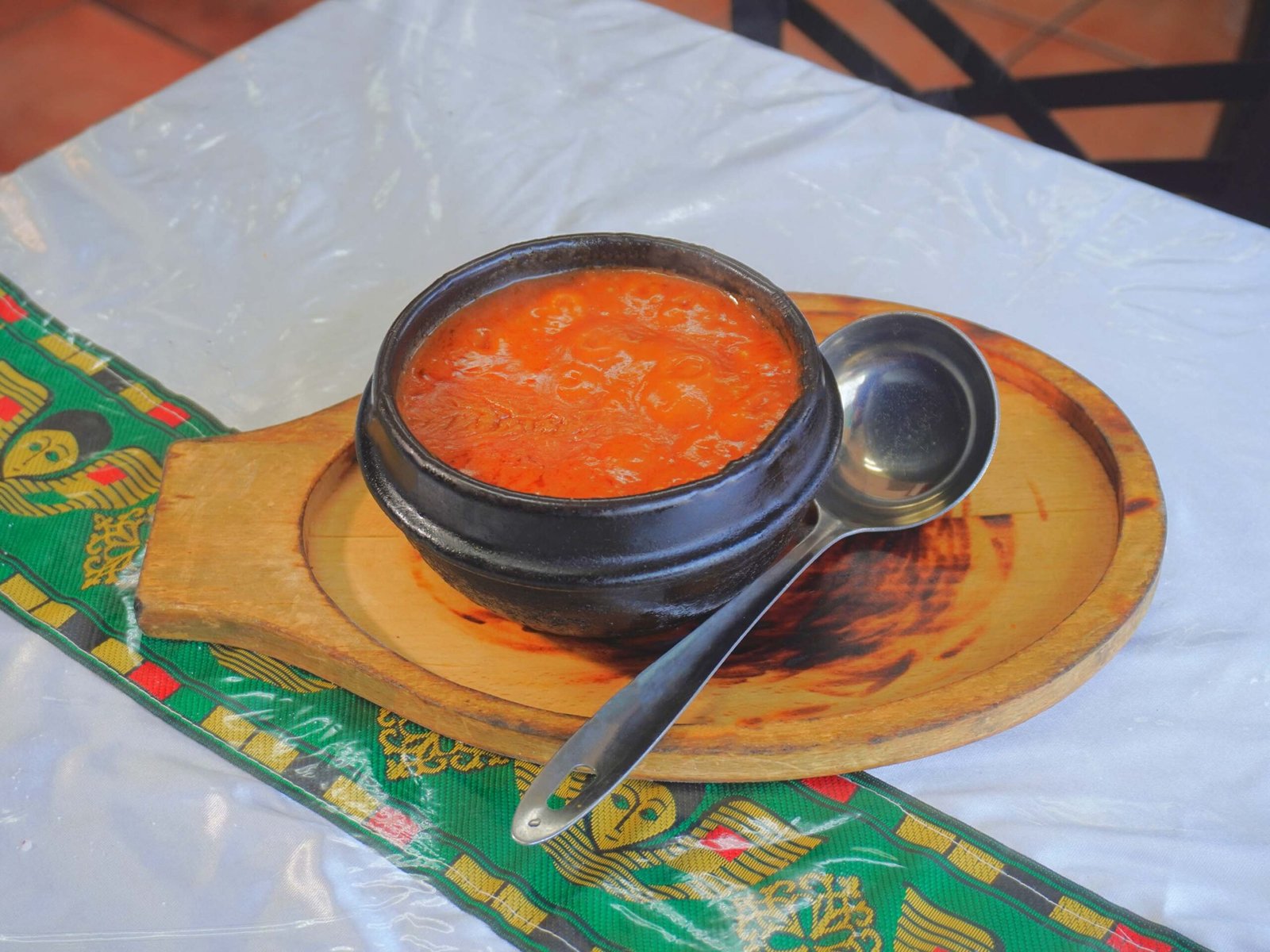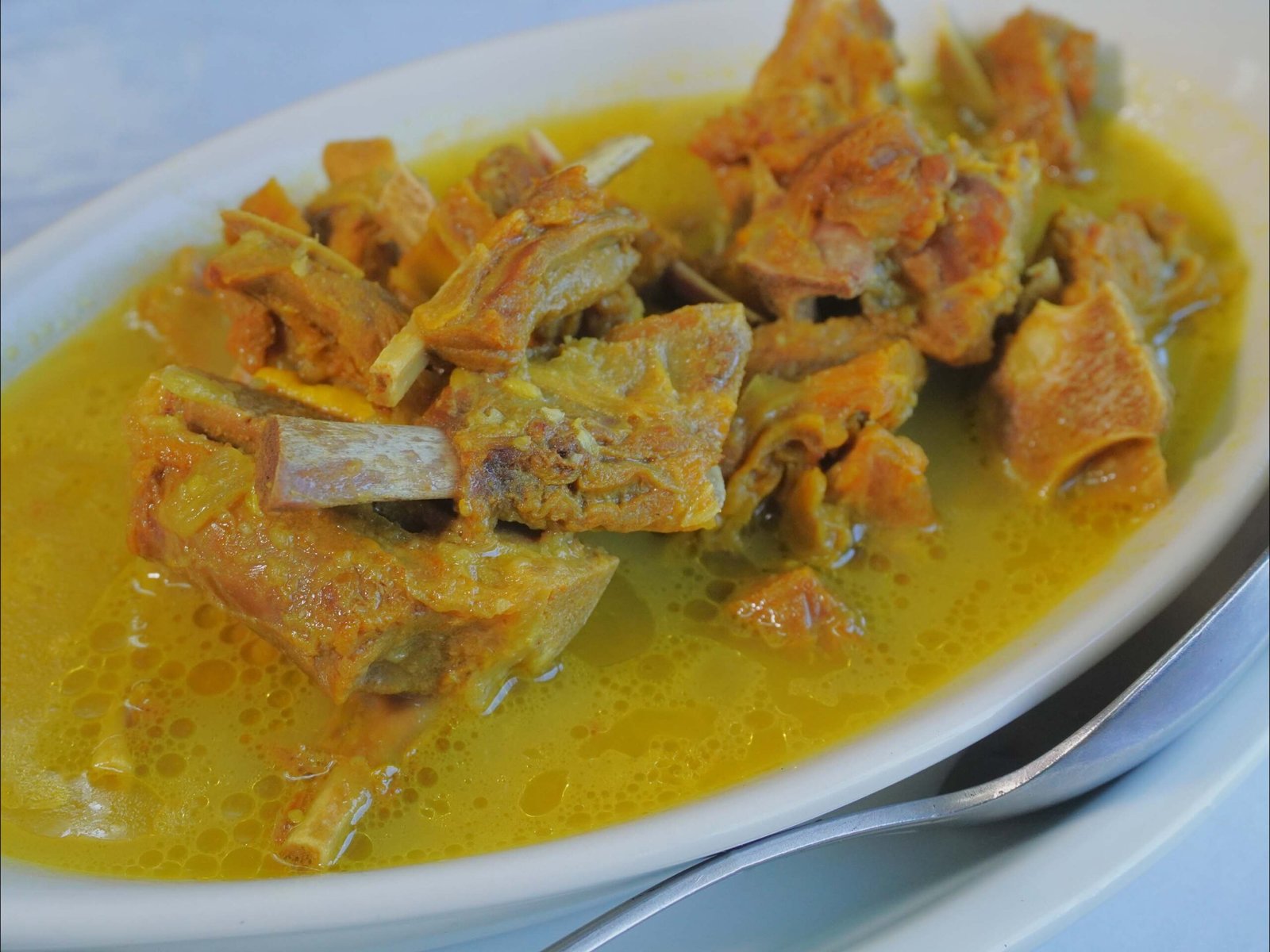 Lamb soup made with turmeric sauce, garlic, spices, and pieces of injera.