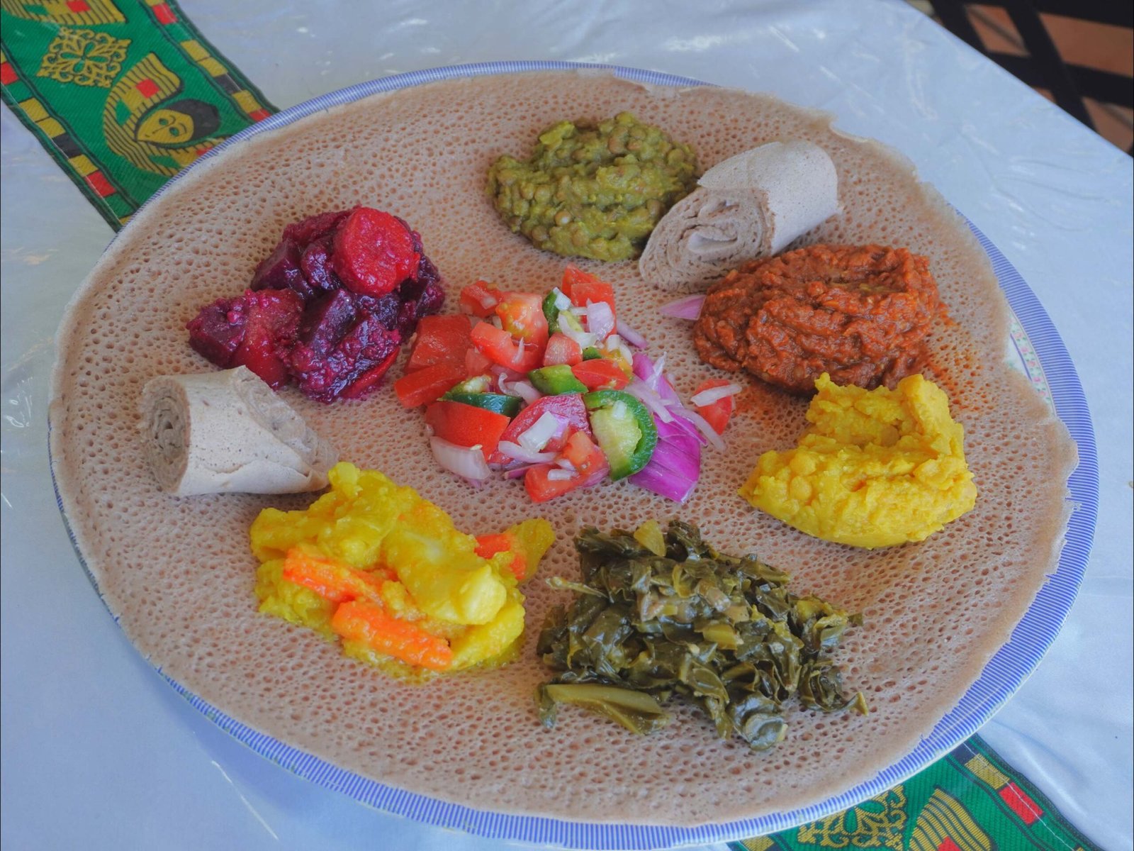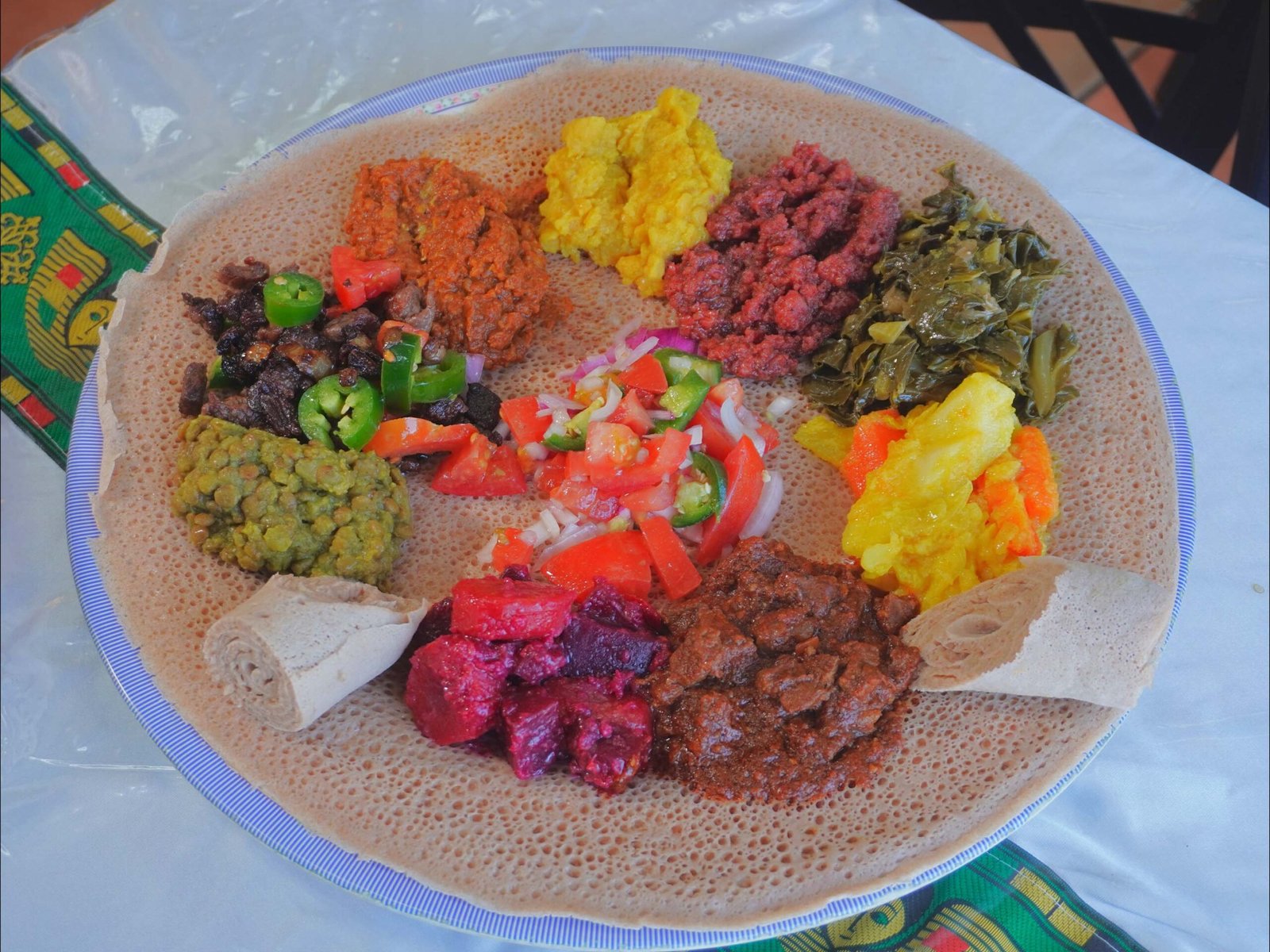 Red lettuce, yellow split, collie green potato, carrot beets, carrot green, lettuce green, beans, carrot salad, dry fish, kitfo, awaze tibs.