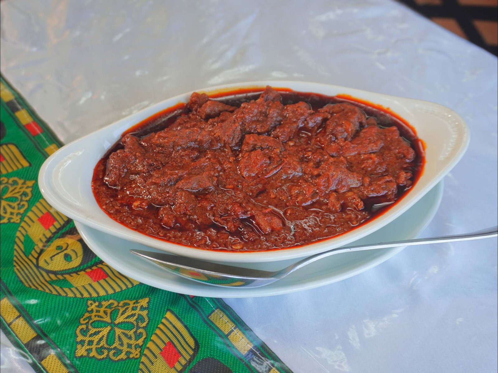 Freshly made lamb stew served with 4 to 5 slices of injera.