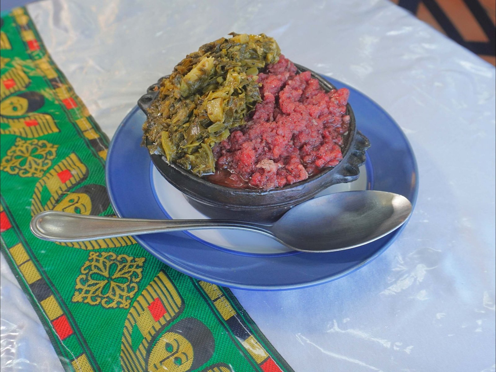 Regular kitfo with cottage cheese and diced collard greens. Comes with 4 slices of injera.