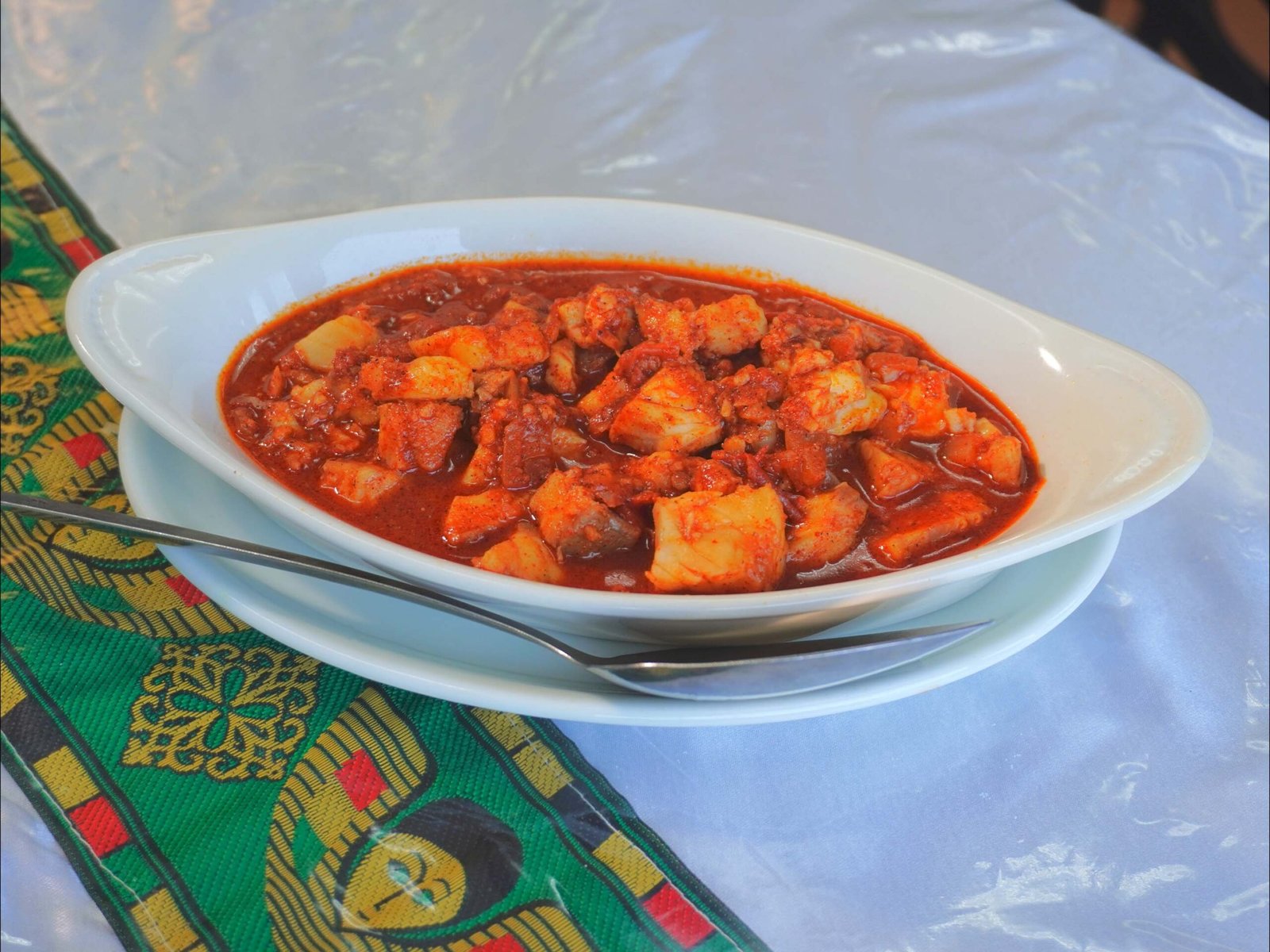 Onions, garlic, tomatoes, and jalapeño peppers. Choice of rice or injera.