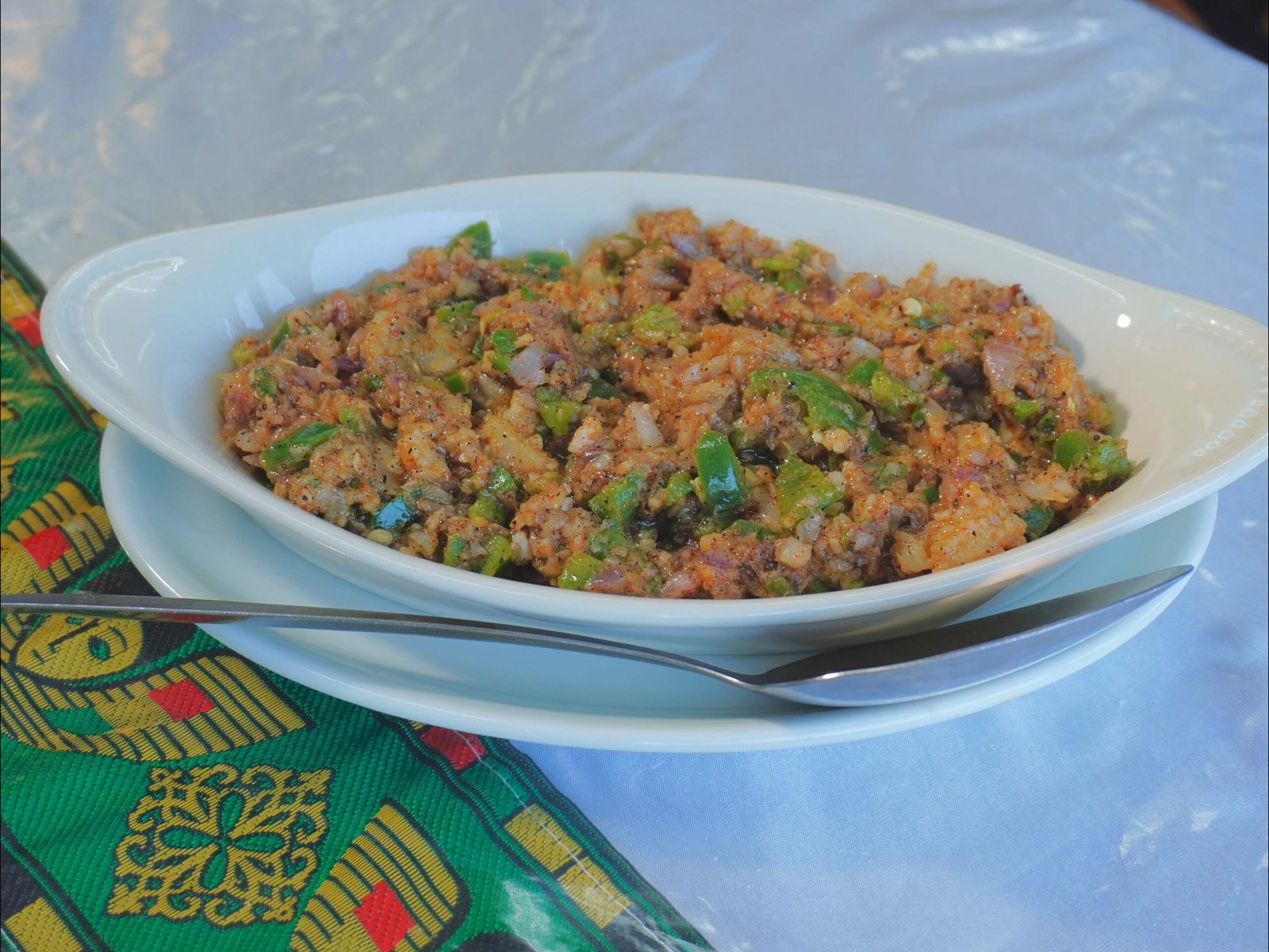 Freshly minced tilapia fish sautéed in a special blend of spices, onion, and jalapeño. Comes with 4 to 5 slices of injera.
