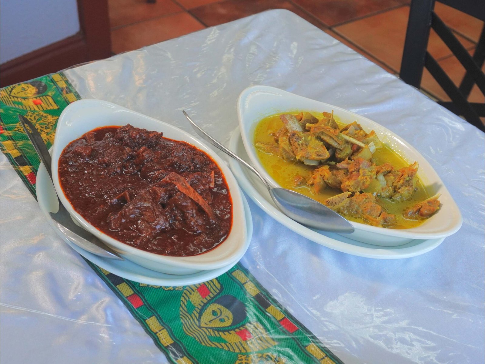 Spicy hot stew and regular stew served half and half, mixed with pieces of injera.